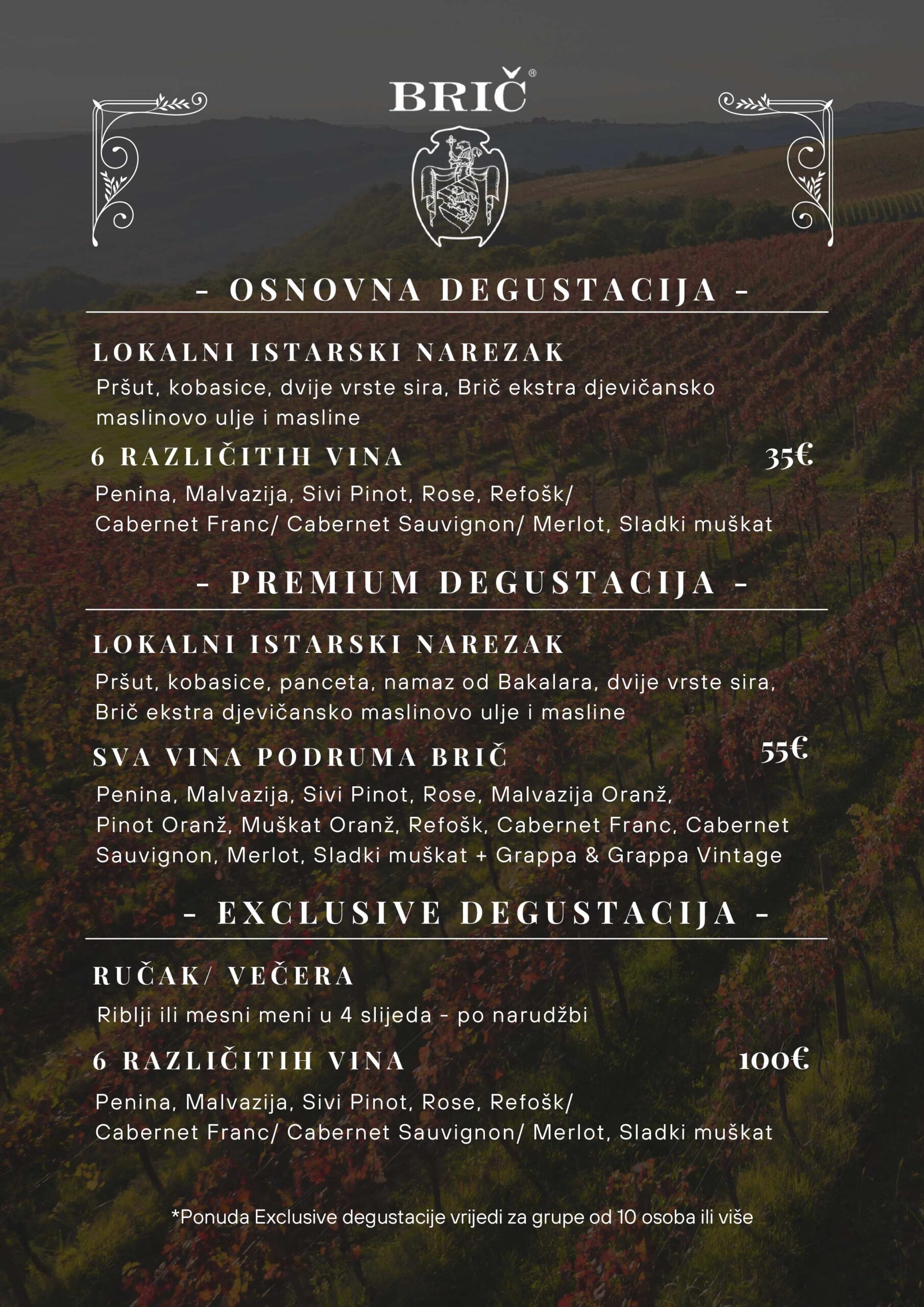 Vinarija Brič uvrštena je među 100 najljepših vinarija na svijetu. U spoju tradicije i suvremenosti nudimo vođene obilaske imanja i podruma, stručna kušanja vrhunskih vina i organizaciju različitih događanja.